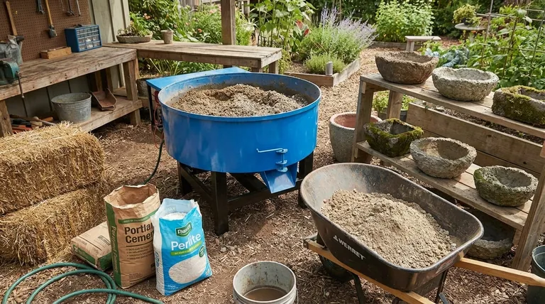 물을 추가하기 전에 시멘트, 펄라이트/모래, 피트모스를 믹서에 넣습니다. 균일하고 일관된 색상이 될 때까지 몇 분 동안 건조 구성 요소를 회전시킵니다. 이 단계는 최종 제품의 약점을 피하는 데 중요합니다.